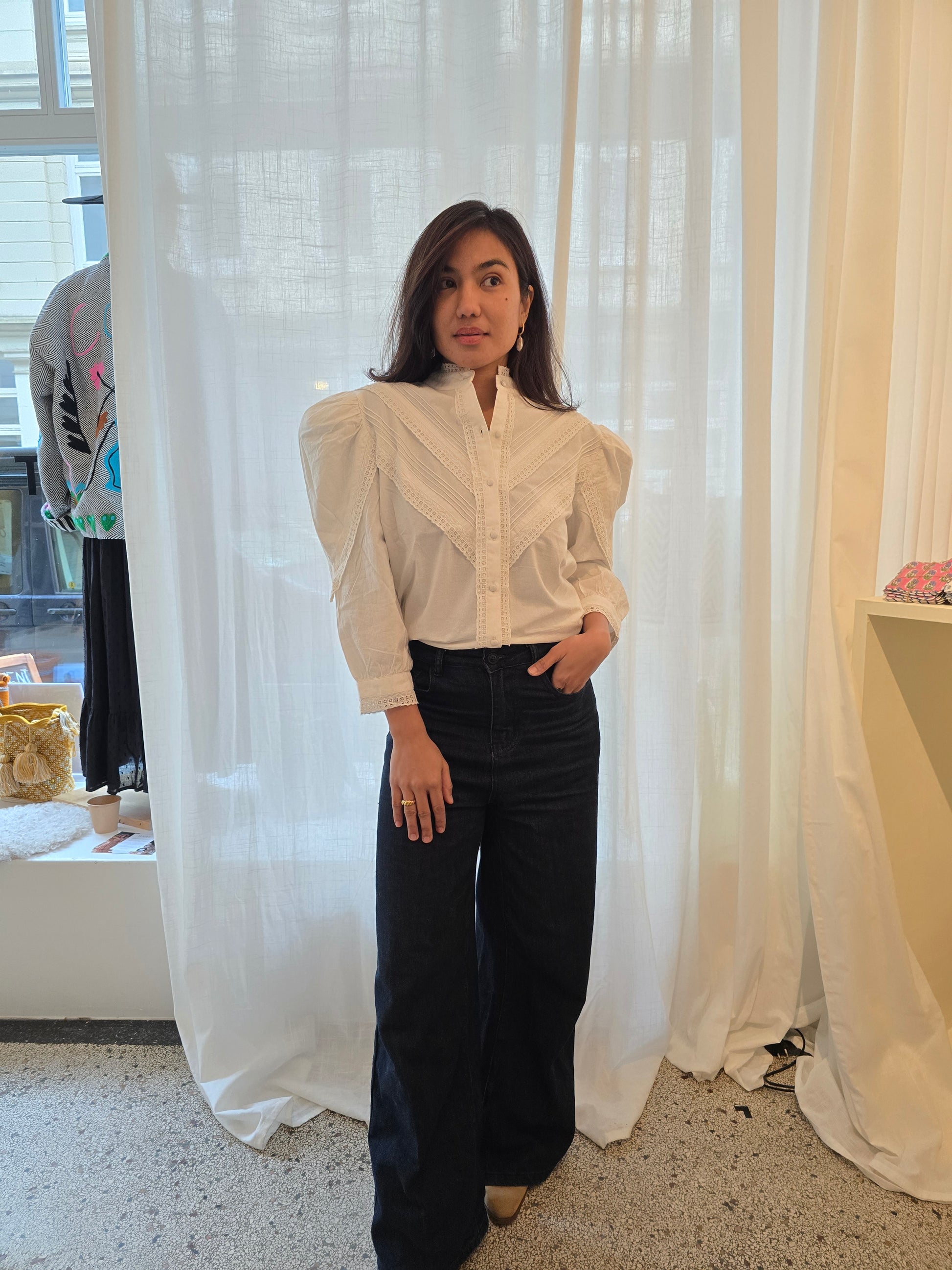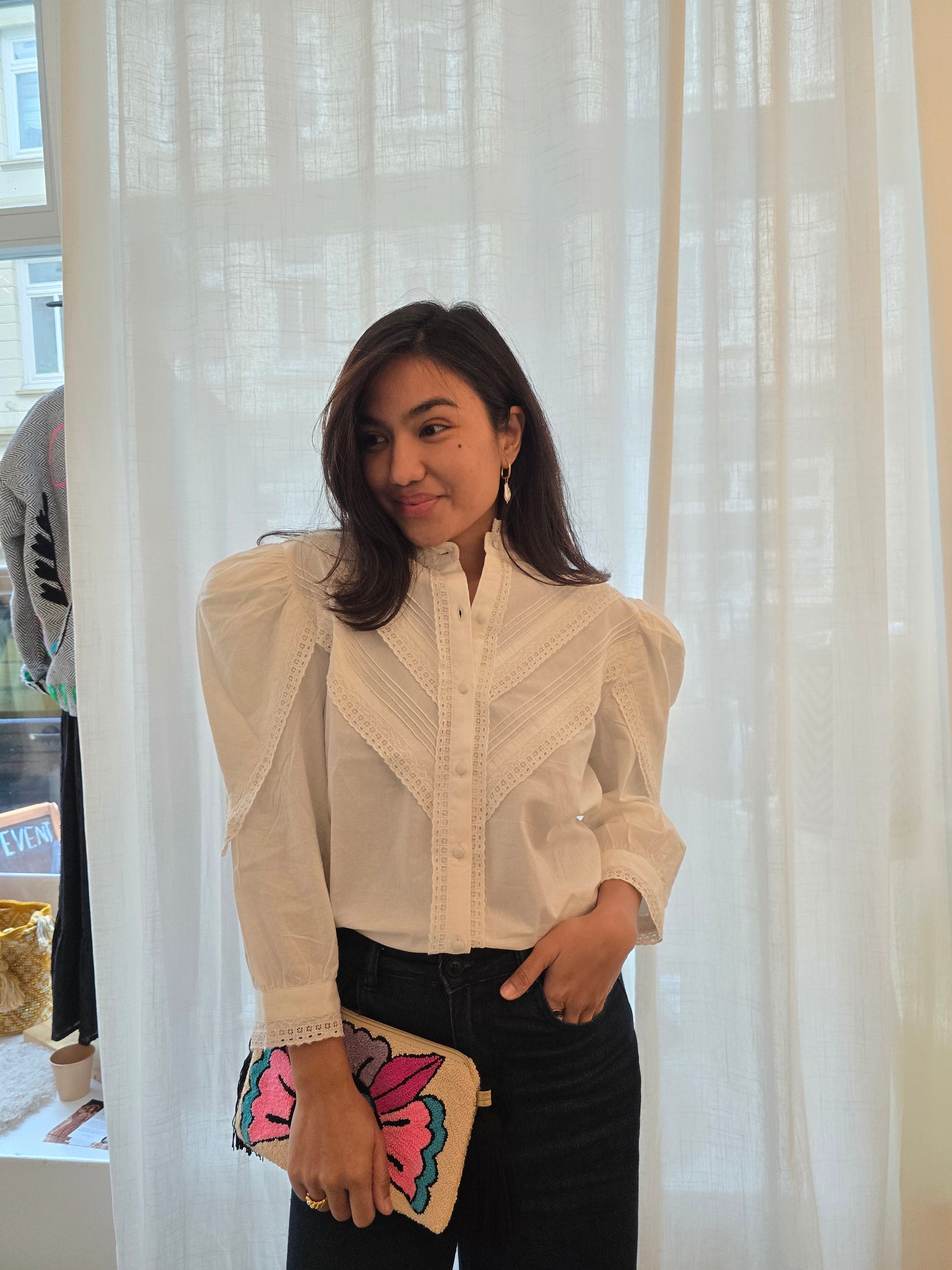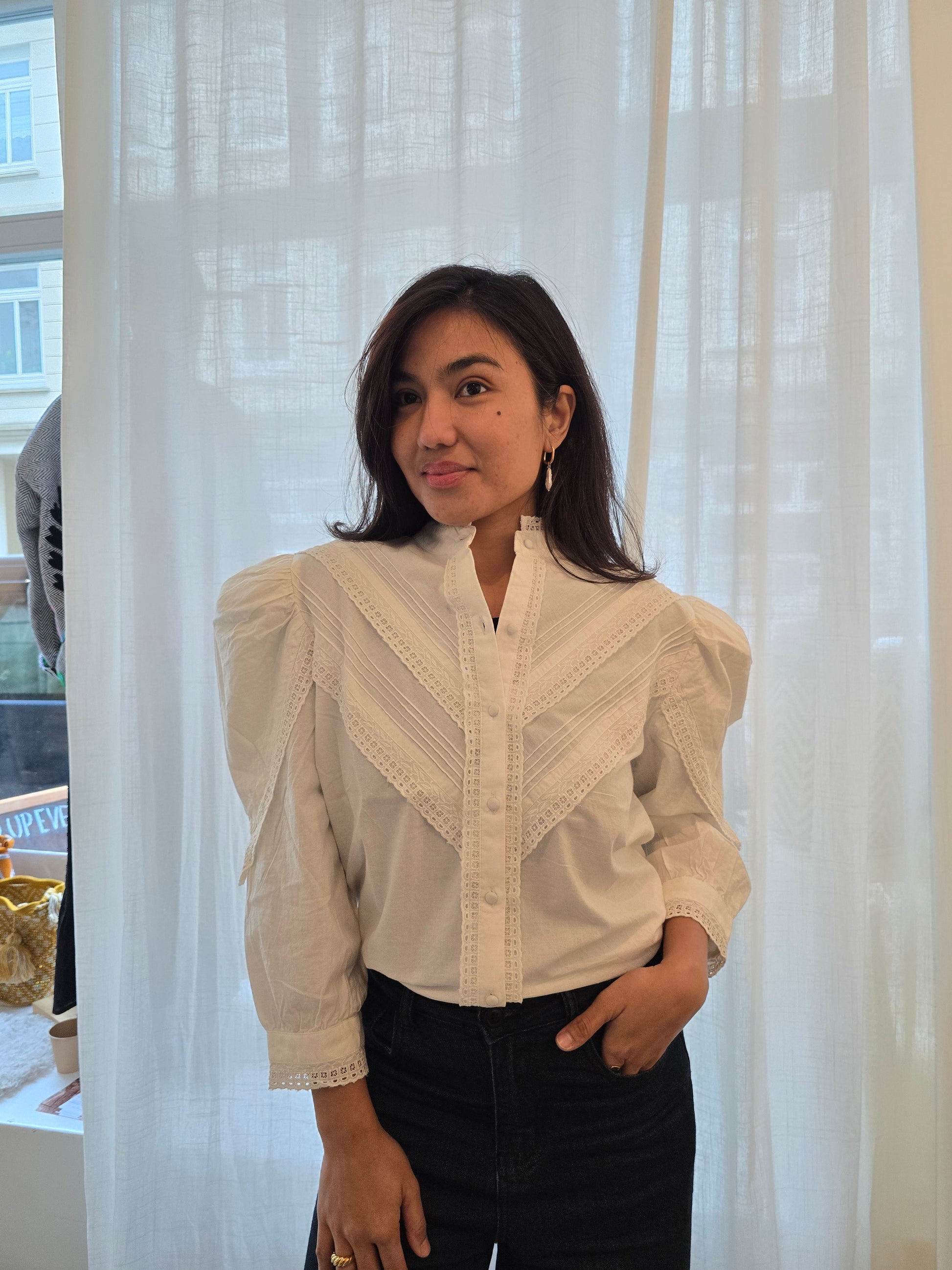 Die Bluse Chloe ist ein romantisches Kleidungsstück, das von Vintage-Designs inspiriert ist. Fein gearbeitete Spitzendetails unterstreichen ihren femininen Charme. Mit ihren eleganten Dreiviertelärmeln verleiht diese Bluse jedem Outfit mühelose Raffinesse – stilvoll, vielseitig und wunderschön verarbeitet.