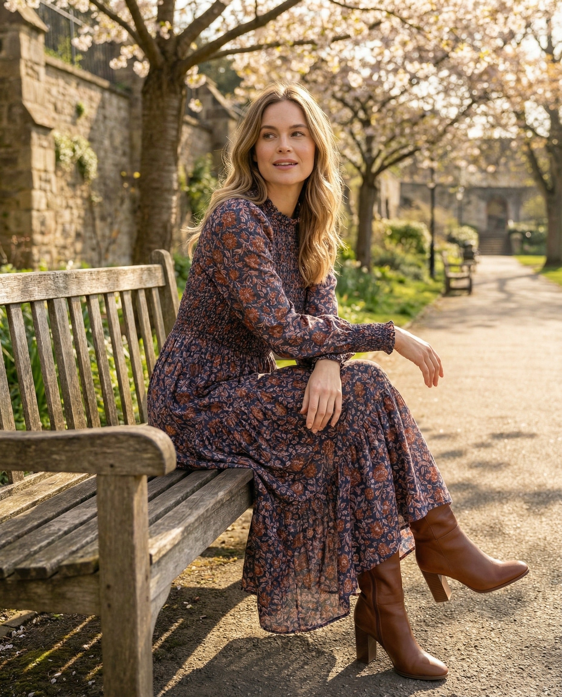 Die schönen Grün- und Rosatöne verleihen dem Design eine frische und romantische Note. Das Kleid hat einen schmeichelhaften Ausschnitt, ein gesmoktes Oberteil und einen fließenden Rock, der sowohl bequem als auch anmutig ist.