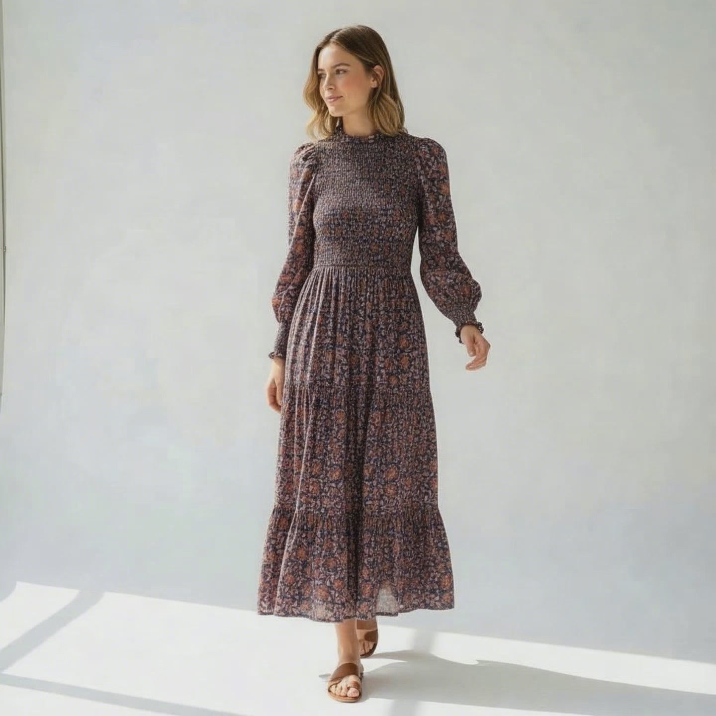 Entdecken Sie den Charme von Bella. Das Kleid im Vintage-Stil ist aus Baumwolle im Blockdruckverfahren gefertigt. Dieses exquisite Stück vereint mühelos traditionelle Handwerkskunst und vermittelt ein Gefühl von zeitloser Eleganz und Kunstfertigkeit, wobei jedes Motiv sorgfältig von Hand auf den weichen, atmungsaktiven Baumwollstoff geprägt wird.