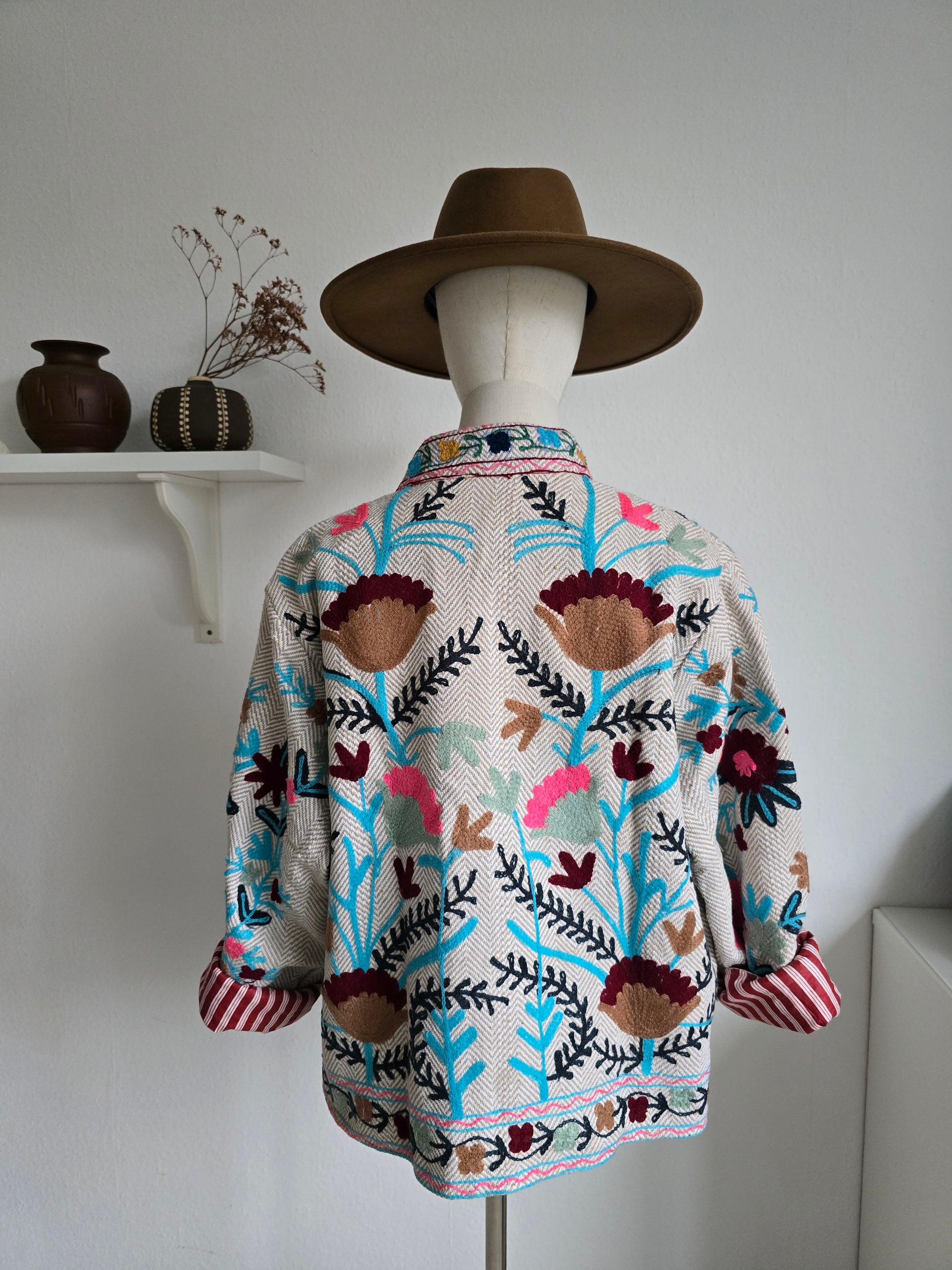 Mit ihrer entspannten, geraden Silhouette und der wunderschönen Handstickerei ist diese Jacke ein echtes Statement-Piece. Perfekt zum Layern das ganze Jahr über und ideal, um jedem Outfit mühelos Stil zu verleihen.
