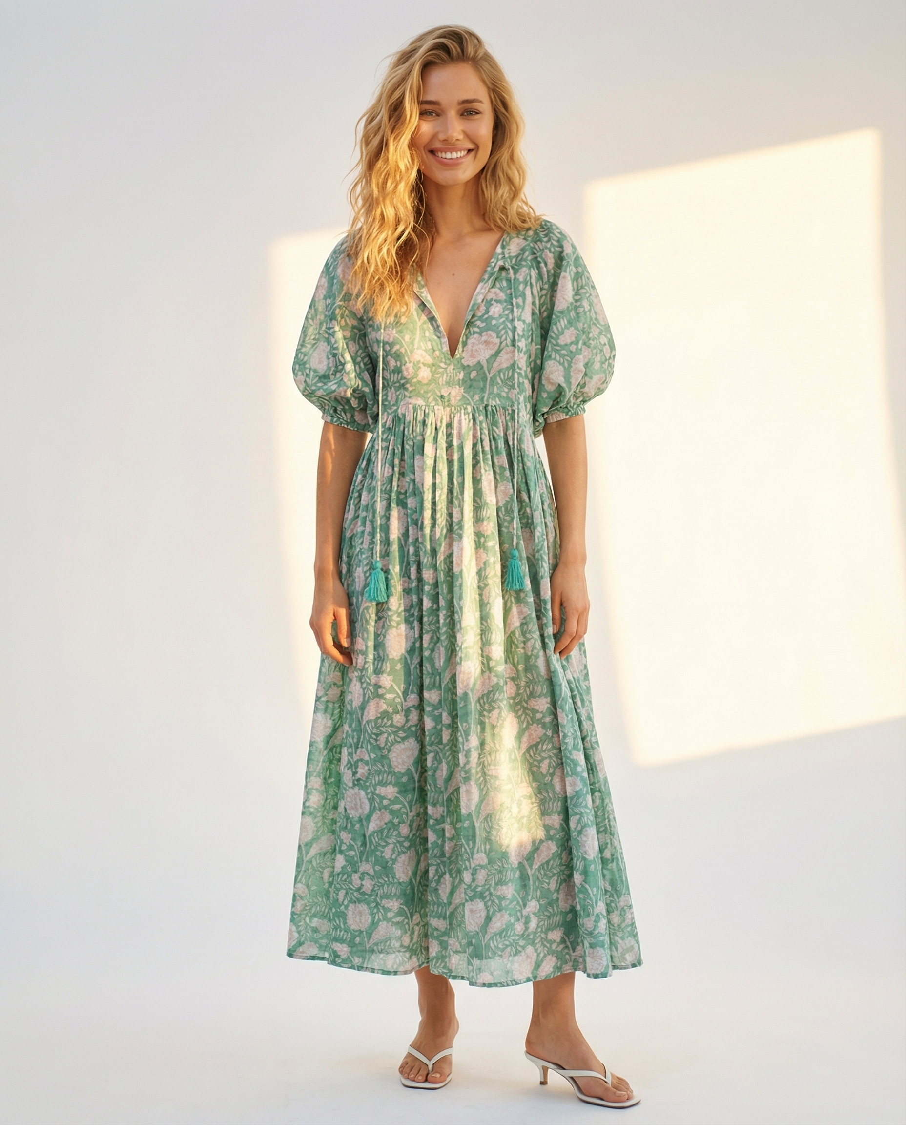 Das Camilla ist ein Vintage-inspiriertes Kleid mit Handblockdruck, das über gebauschte Ärmel und zwei Seitentaschen verfügt. Es sieht sehr elegant aus und eignet sich perfekt als Tages- und Abendkleid. Der Stoff fühlt sich leicht auf der Haut an und fällt wunderbar.