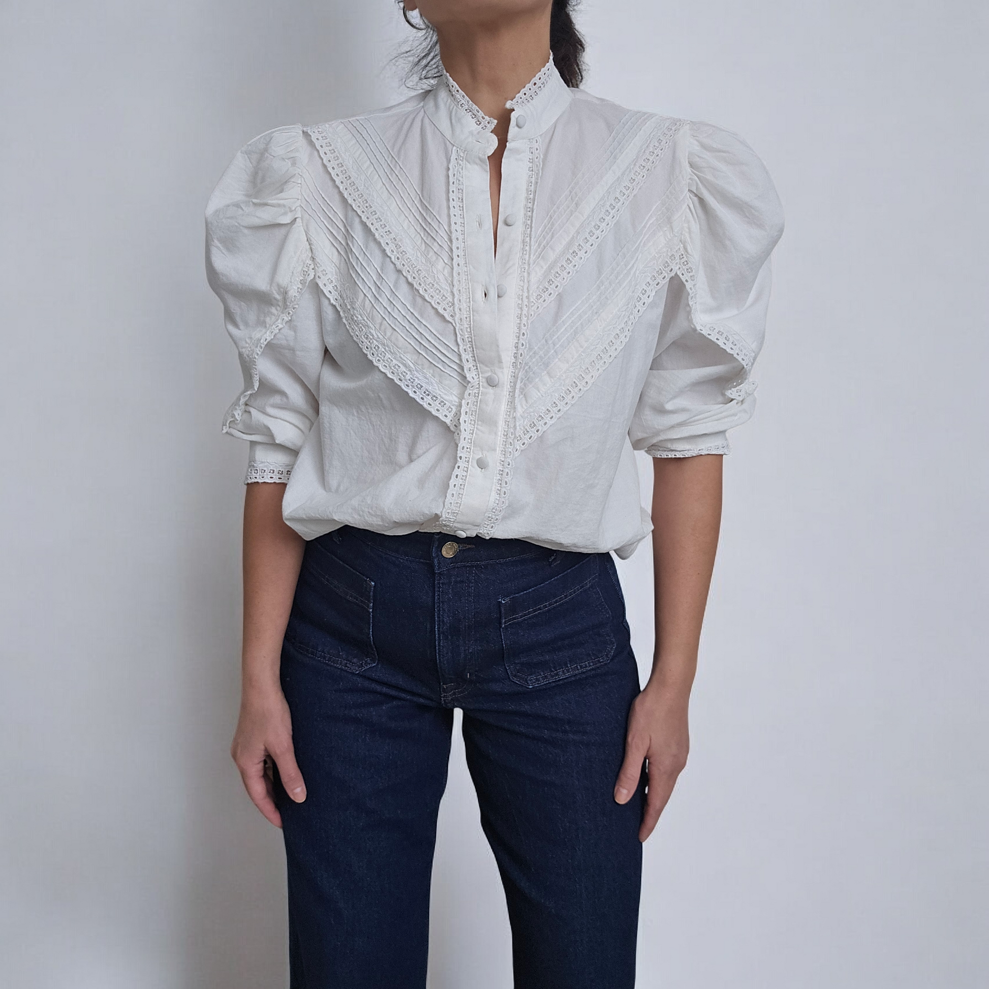 Die Bluse Chloe ist ein romantisches Kleidungsstück, das von Vintage-Designs inspiriert ist. Fein gearbeitete Spitzendetails unterstreichen ihren femininen Charme. Mit ihren eleganten Dreiviertelärmeln verleiht diese Bluse jedem Outfit mühelose Raffinesse – stilvoll, vielseitig und wunderschön verarbeitet.