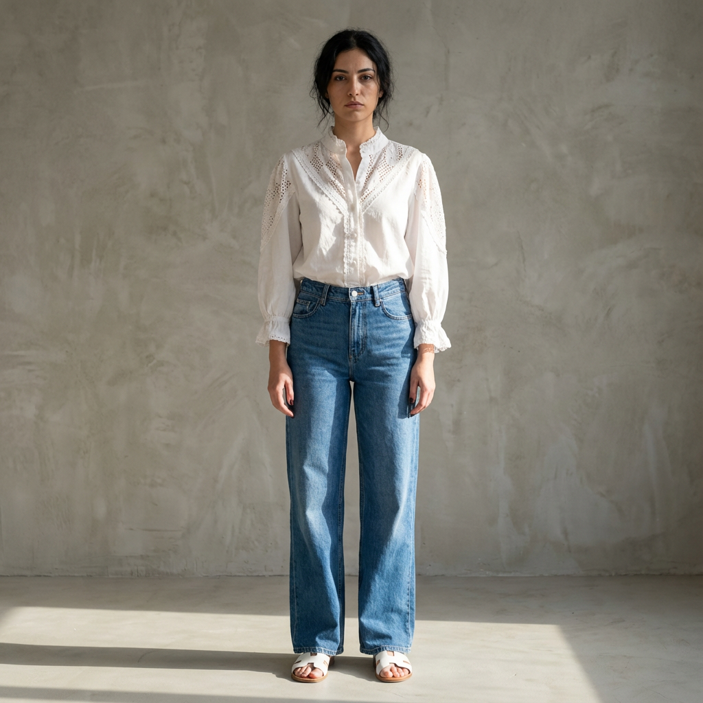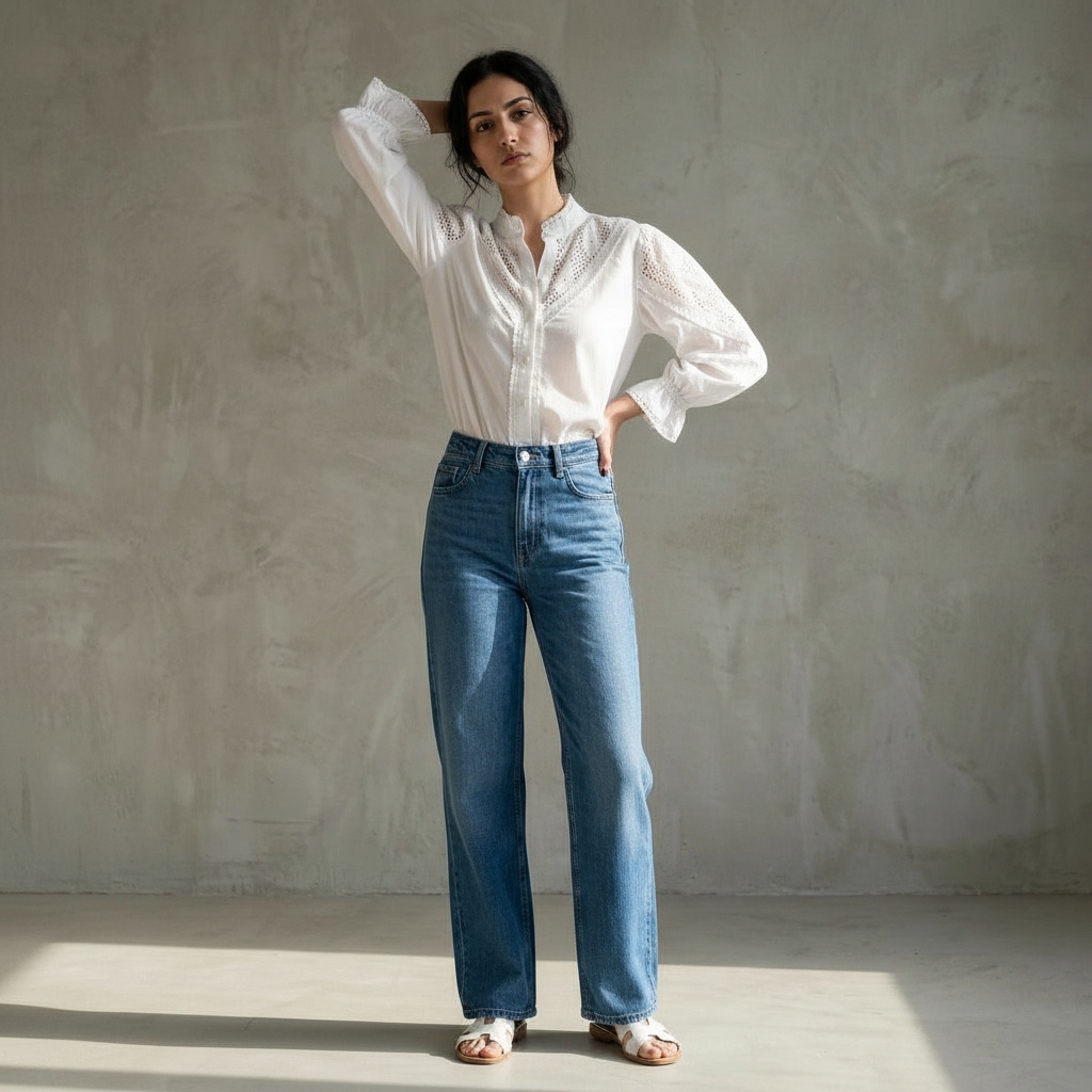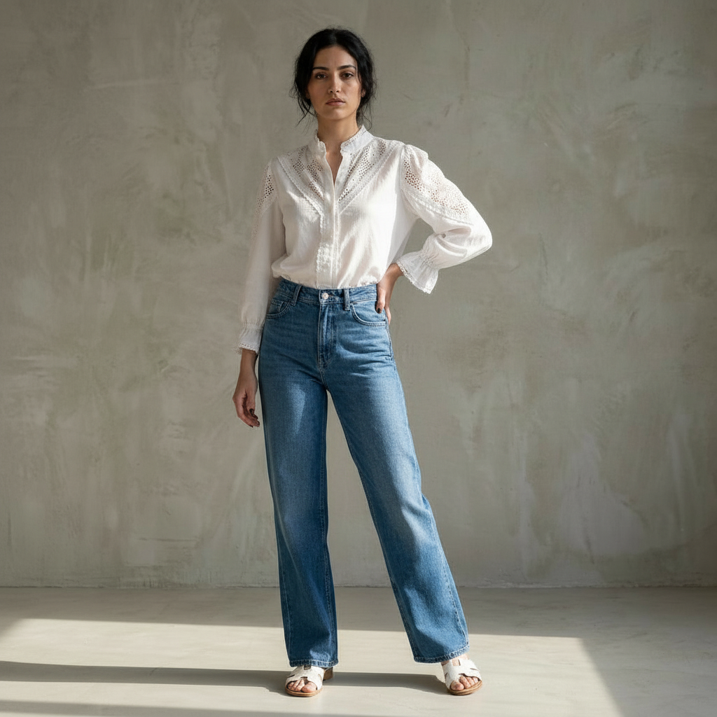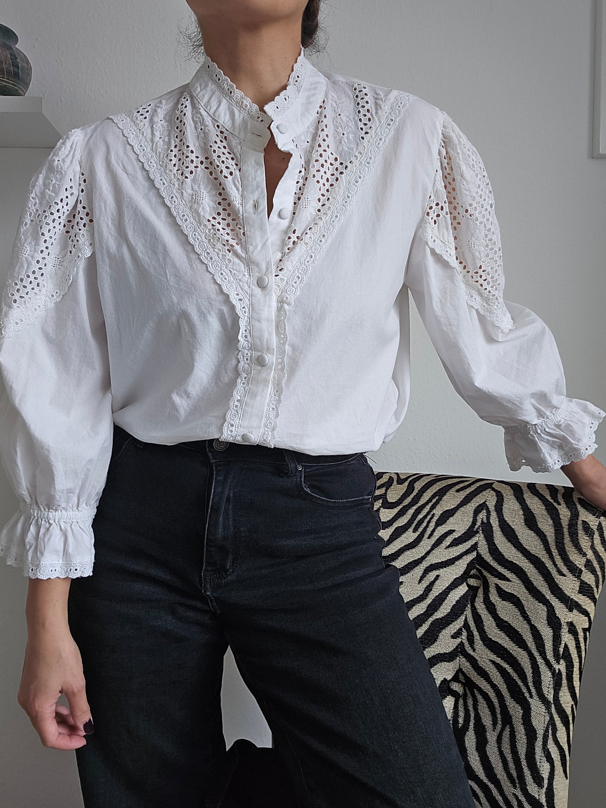 Die Zoey-Bluse aus Baumwolle ist ein von Vintage inspiriertes Modell aus reinweißer Baumwolle mit zarten Spitzeneinsätzen, Puffärmeln, hohem Kragen und stoffüberzogenen Knöpfen für einen romantischen, zeitlosen Look.